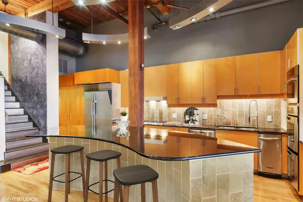 Residence 438 @ 1000 West is located in the BULLSEYE of the West Loop, on Restaurant Row and amongst coveted Fulton Market, where the highest concentration of fine dining exists in the city. Heart of the West Loop located West of Halsted, east of Racine, north of Monroe to Fulton Market champions any blue chip neighborhood and remains one of America's top neighborhood's to live in across the nation's metro landscape. Residence 438 offers 2,400 square feet of a 40' wide floor plan with gracious formal entry, sumptuous primary suite with custom built in closets and organizers, completely enclosed "womb-like room accommodates king size bed comfortably. Bathroom dressed in floor to ceiling timeless limestone, wall mounted plumbing fixtures, separated air jetted soaking tub, oversized shower with frameless glass, bench and six body sprays. All wall hung toilets. First floor powder room with Asian relic sink atop a custom vanity. A central, entertainer's wildest dream kitchen with two large serpentine islands, bull nosed, 1.25" granite counters, bar stool seating for 12 set the tone for entertainment. Expansive chef's kitchen featuring custom-made Birch cabinetry, double door 48" SubZero, Gaggenau high output six burner cooktop, Gaggenau culinary hood, double oven, Fisher and Paykel double dishwashers, Dual refrigerator and freezer Subzero drawers for overflow, wine refrigerator and ice maker. Vast 40'x25' open living/dining space easily accommodates three to four separate seating arrangements, private balcony overlooking Randolph Street with open cityscape and urban views off of living room. All real "tongue and groove" oak harwood floors throughout. Exposed 17' timber ceilings, columns and metal collar supports. North wall of all exposed brick and enormous commercial grade dual paned windows. Mezzanine level showcases a unique full bathroom dressed in limestone, Asian pudding stone vessel sink, jagged limestone cut vanity counter. Tub/shower combination. Walk in, professionally organized closet, built in desk and second bedroom. Furnace, air conditioner, hot water tank replaced in 2016. SubZero replaced 2021. Completely enclosed first floor garage parking space (B-21) asking $25,000. A one of a kind unit in the most unique loft building in all of the West Loop with over 136 different floor plans and a growing number of combined units. Unit price per foot is $341. Rare find of a 40' wide loft residence with versatile layout and ability to alter floor plan if necessary for your needs or to put your own personal stamp on this home. Show today.